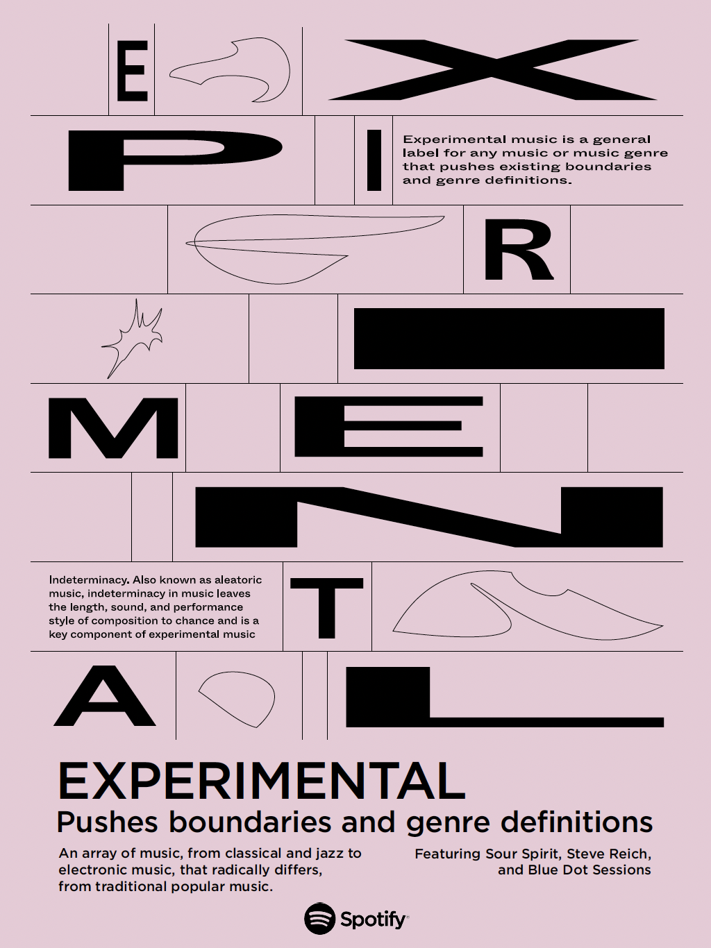 Animation Prompt: Spotify is home to millions of songs and over 5,000 distinct genres. We (listeners) so easily fall into the habit of listening to the genres we always have. While there is nothing wrong with loving the music you know, Spotify encourages its listeners to break outside their normal patterns and be an explorer of music. Music from all over the world is waiting to be heard by you. This animation will highlight a few genres on all sides of the spectrum while encouraging listeners to branch out and discover more through the use of video footage, stop motion, and poster-like graphic elements. This is Spotify. Discover more.