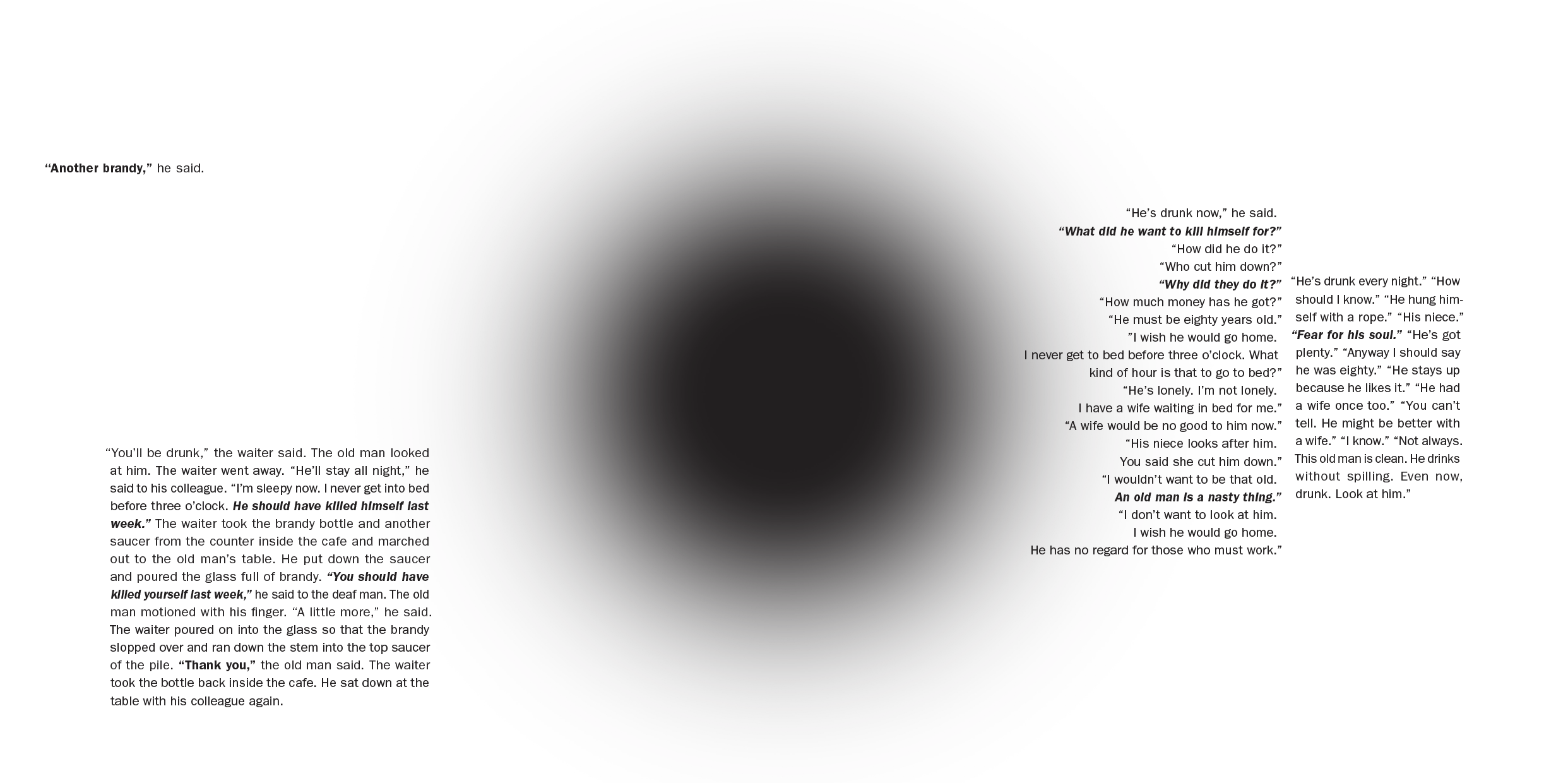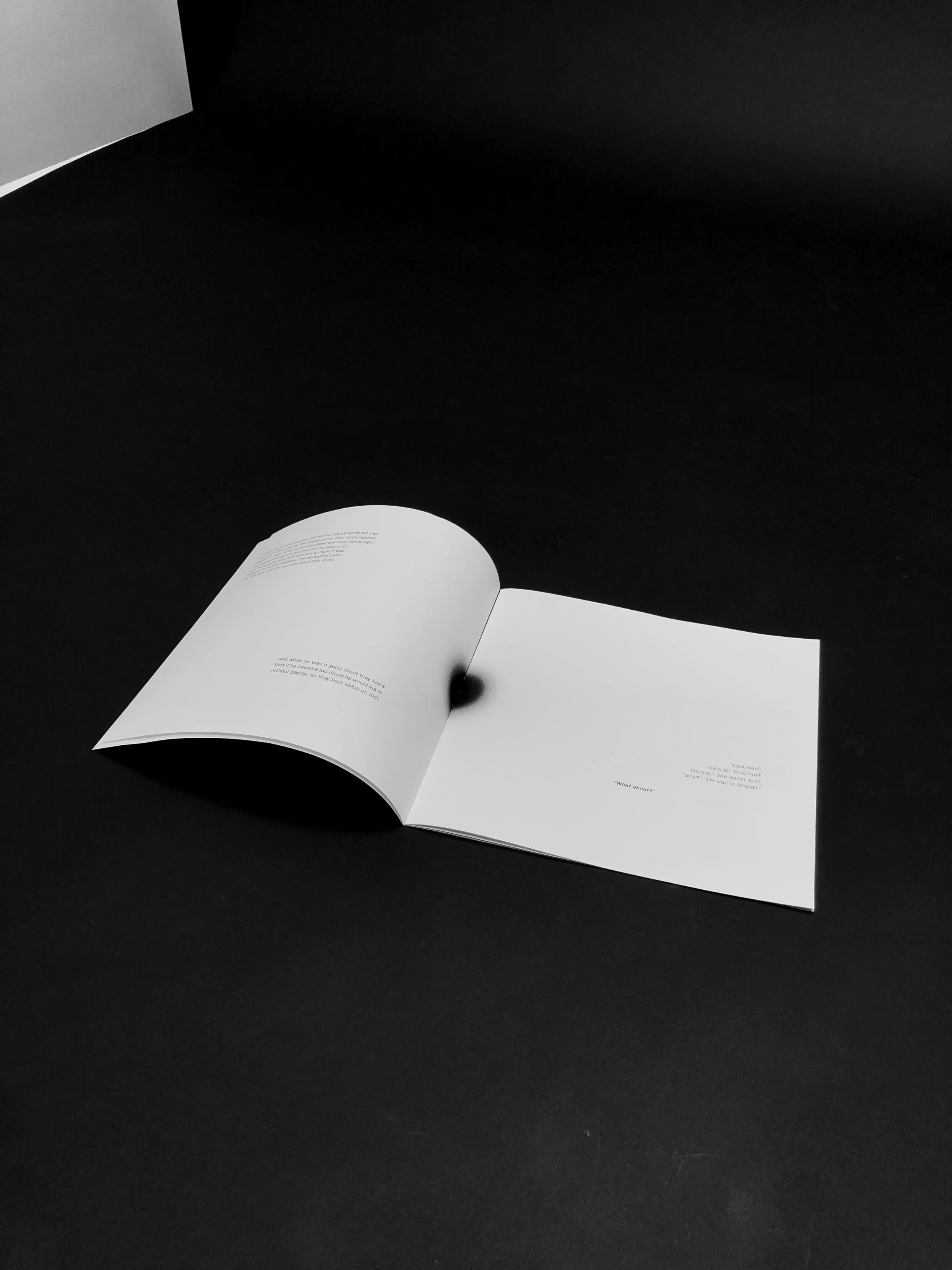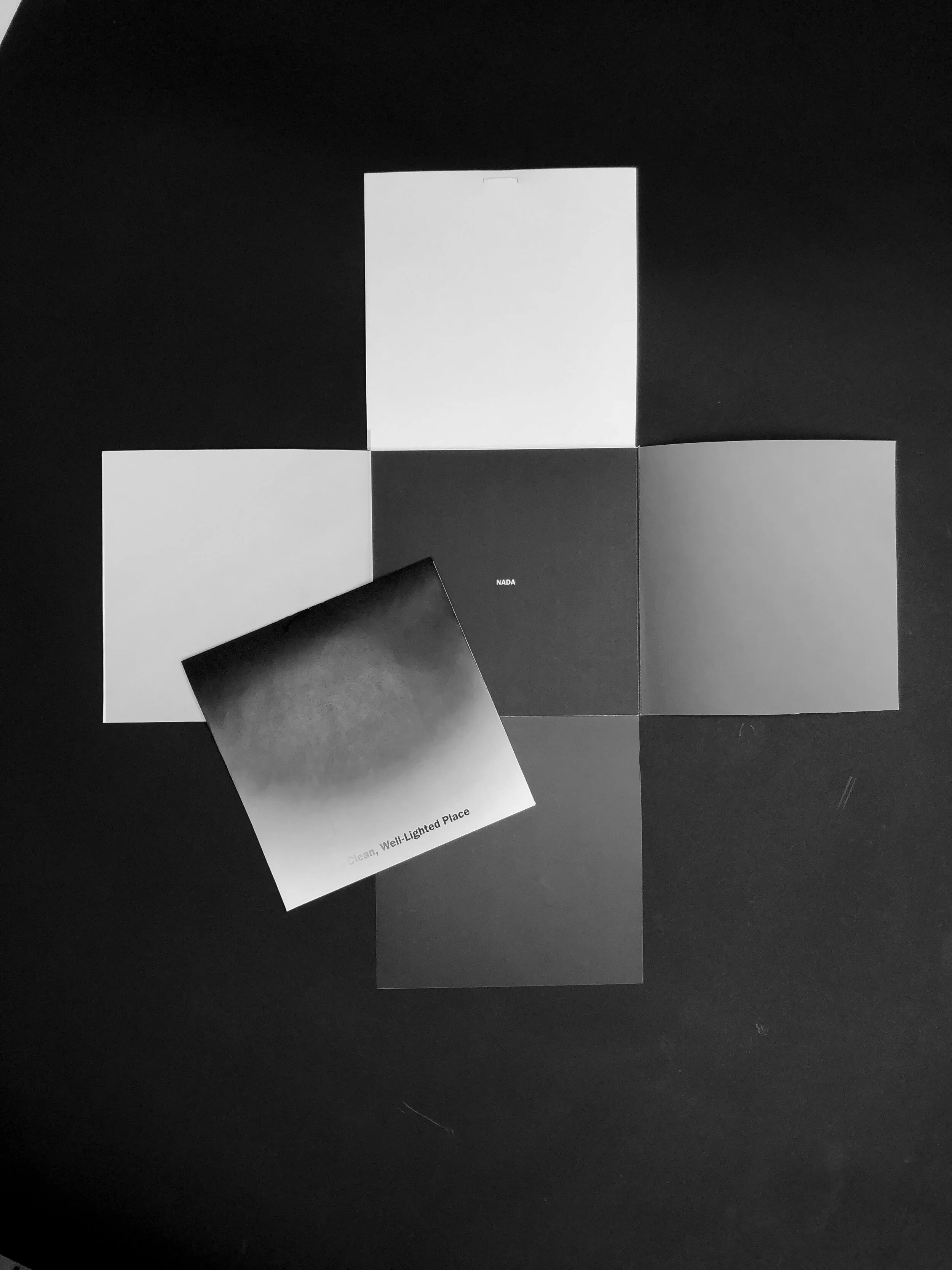 The TYPE BOOK prompt was to choose a text that is about 1200-2000 words long and compile it into a printed and bound book that tells the story and conveys the feeling not only literally but visually. I chose A Clean Well-Lighted Place by Ernest Hemingway. This story starts off feeling like dark humor, harmless but morbid, and quickly grows in extreme sadness until there is nothing left for the reader.