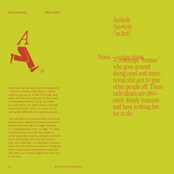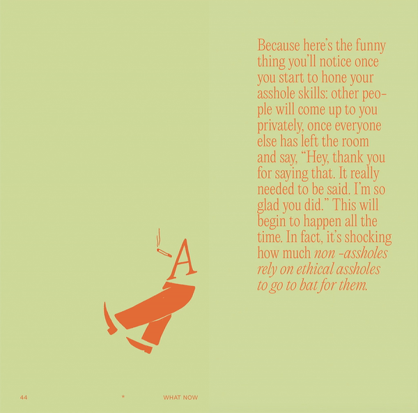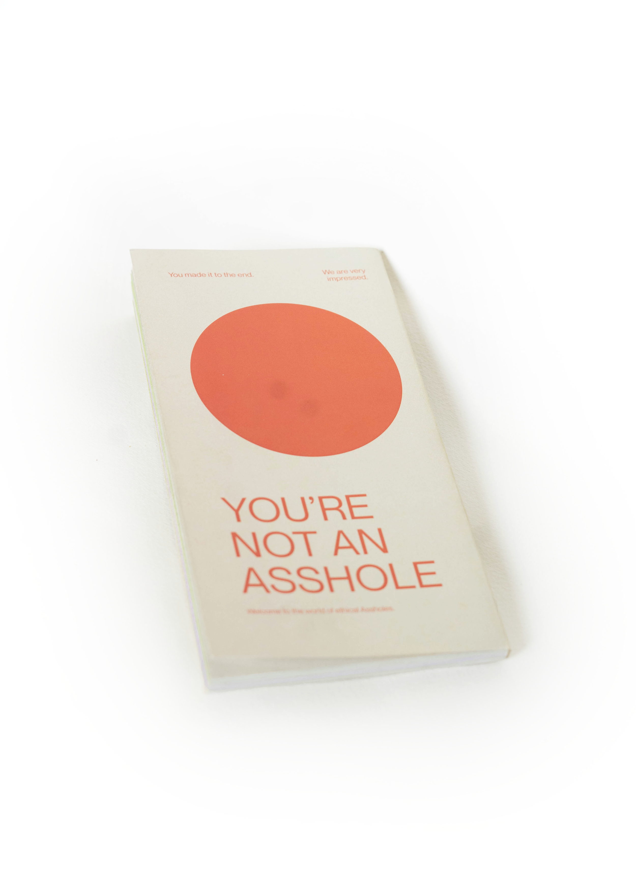 This booklet isn’t here to damn and condemn all asshole traits and pretend like assholes have no role in the world other than wreaking havoc, BUT instead offers an alternative to being a run of the mill, predictable, everyday asshole. Ethical assholes are a national treasure! This book is a a lightly jarring yet modest collection of unsolicited advice on how to be a human. The good, the bad, and the ugly. This book is both satire and completely serious. To reach an asshole, you have to be an asshole.